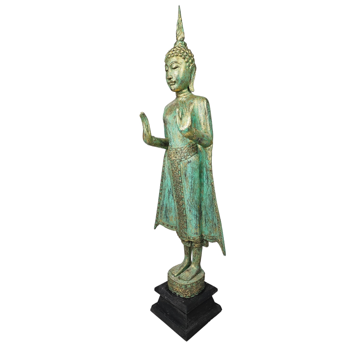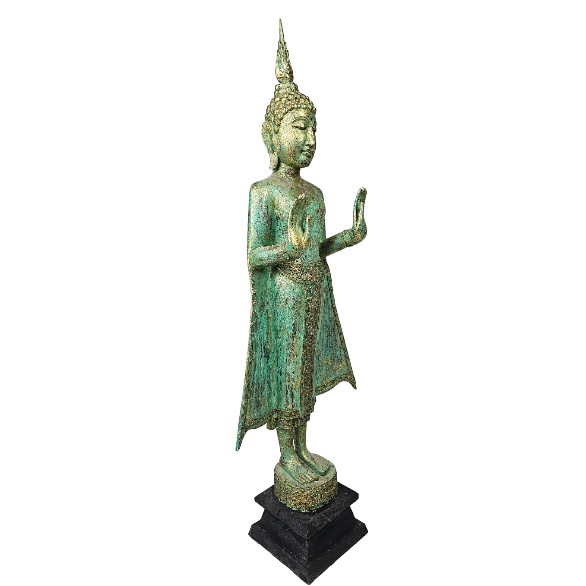 Entdecken Sie den exquisiten handgefertigten Buddha aus Thailand. Dieser einzigartige Buddha präsentiert sich in einer harmonischen Farbenkombination aus Grün und Gold und ist mit atemberaubenden Mosaiksteinen verziert, die in liebevoller Handarbeit aufgetragen wurden. Hergestellt aus robustem Holz, bietet dieses Unikat eine zusätzliche Strukturtiefe, die Ihrem Wohnraum einen Hauch von Eleganz und asiatischer Kultur verleiht. Dieses Buddha Kunstwerk ist nicht nur ein auffälliges Dekorationsstück, sondern auch ein Symbol für Ruhe und Ausgeglichenheit. Tauchen Sie ein in die Welt der Spiritualität mit unserem handgefertigten Buddha. Jeder Buddha ist einzigartig und bringt einen Hauch von Thailand direkt zu Ihnen nachhause.