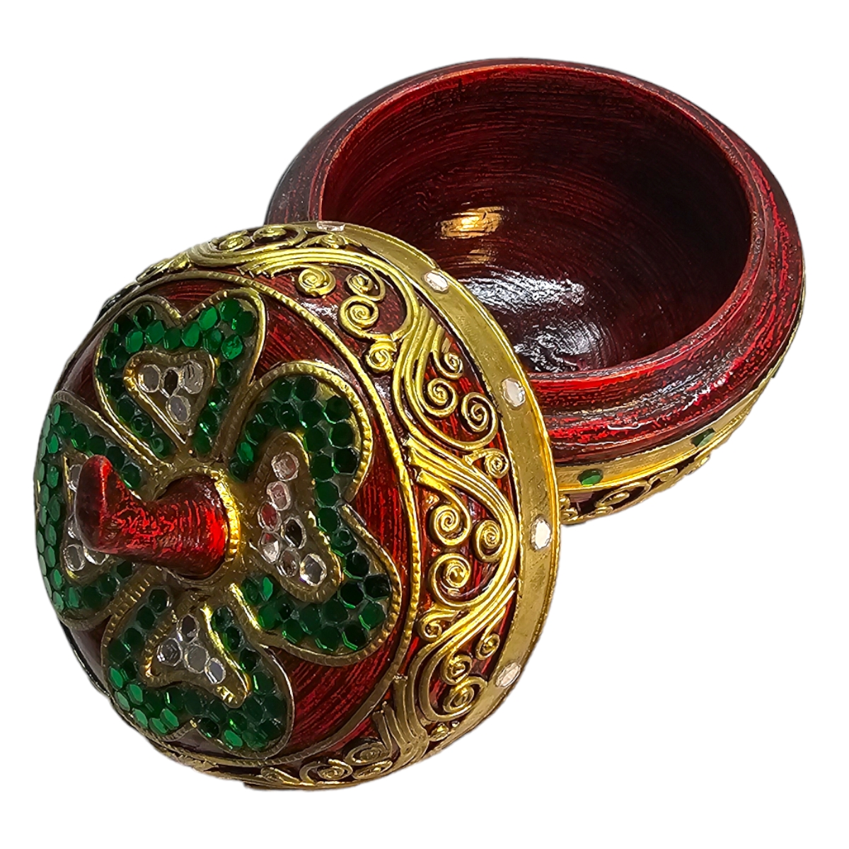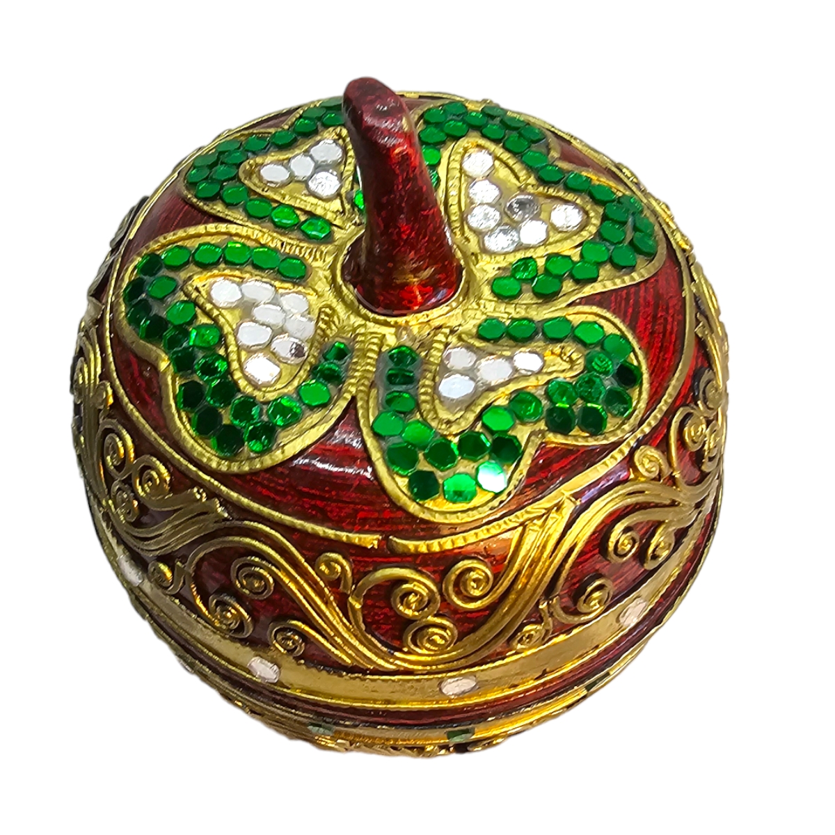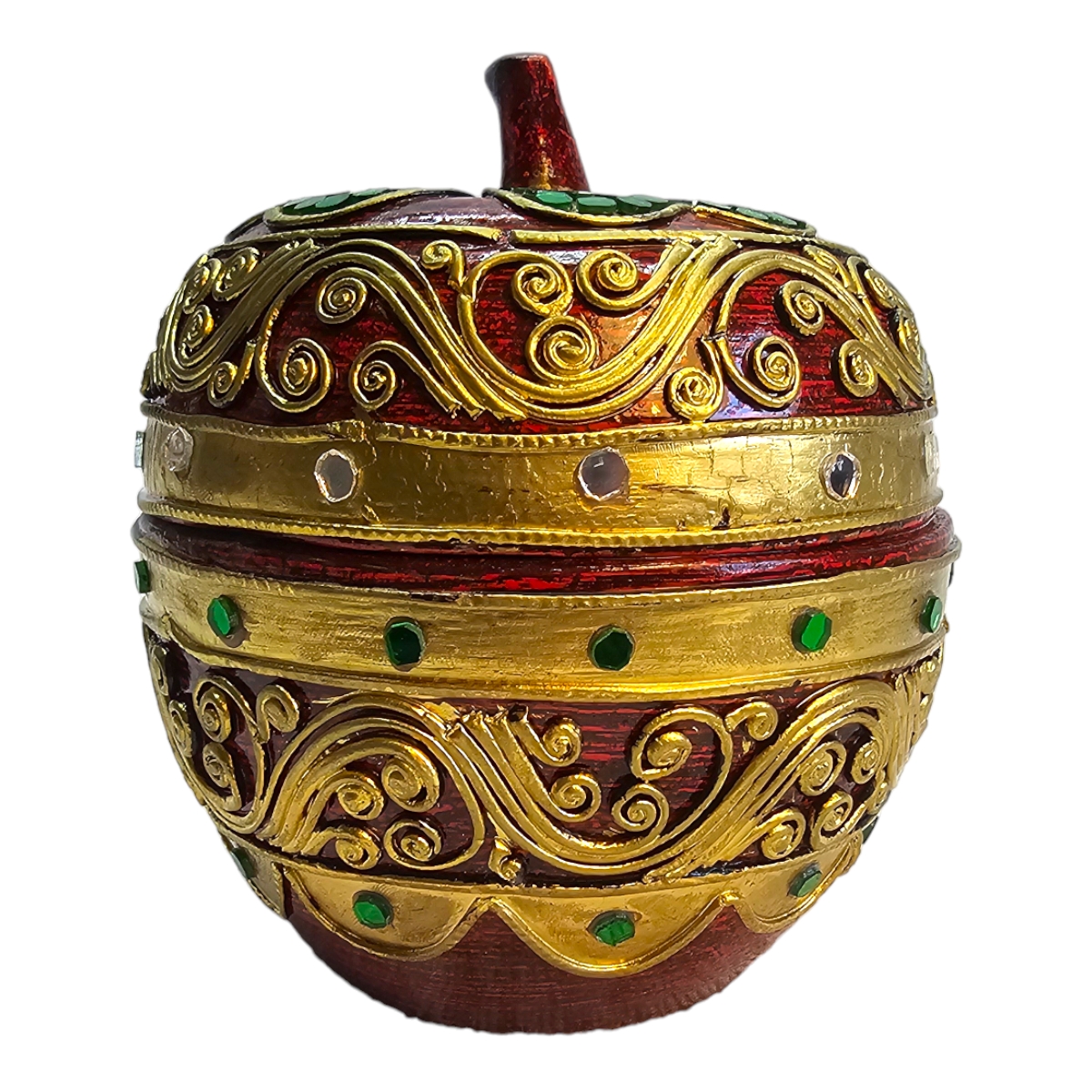 Erleben Sie die exquisite Handwerkskunst aus dem fernen Thailand mit unserer prächtig verzierten Dose. Meisterhaft aus sorgfältig ausgewähltem Holz gefertigt, besticht diese Dose durch ihre einzigartige Apfelform. Hervorgehoben durch goldene Verzierungen, wird die Schönheit dieses Stücks durch farbenprächtige Mosaiksteine zum Leben erweckt. Diese Dose ist nicht nur eine funktionale Aufbewahrungsmöglichkeit, sondern auch ein auffälliges Dekorationsobjekt, das jedem Raum einen Hauch von Luxus verleiht. Hinweis: Jedes Stück wird von Hand gefertigt und kann daher leicht variieren.