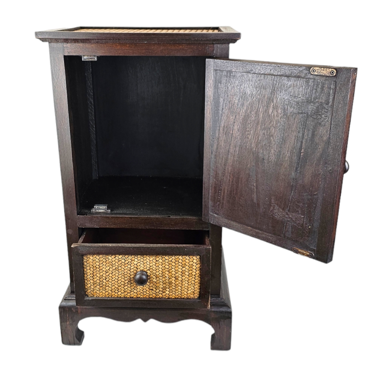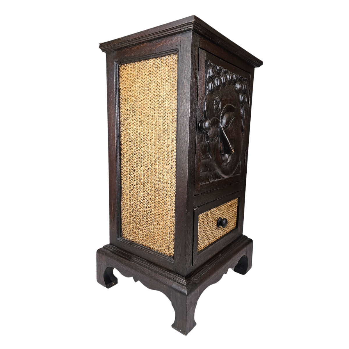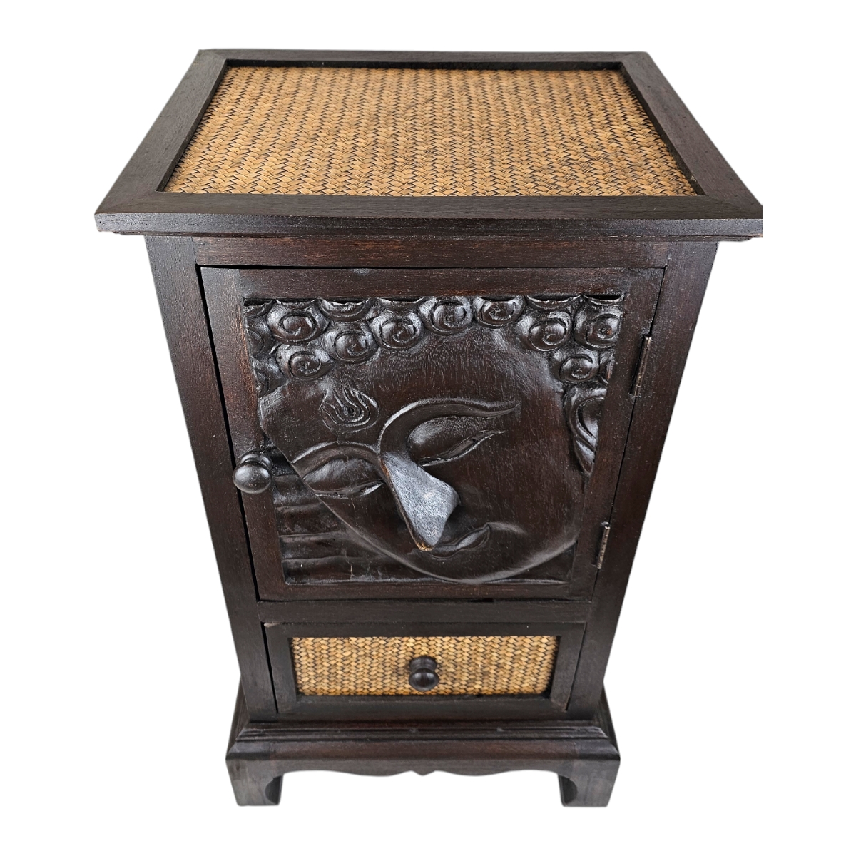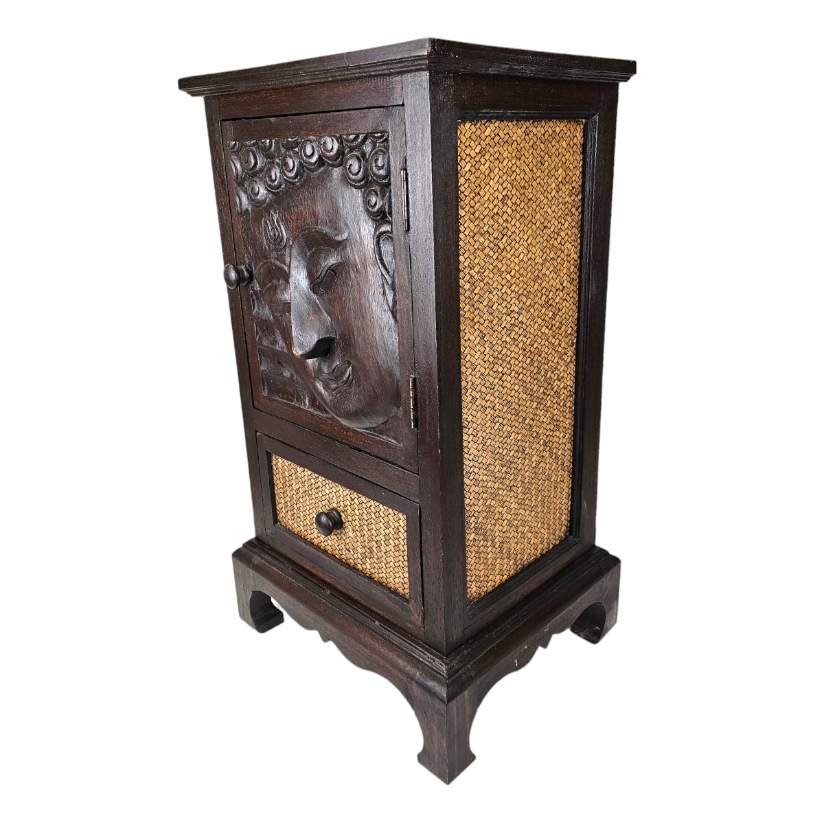 Entdecken Sie die exquisite Handwerkskunst aus Thailand mit dieser atemberaubenden Kommode. Der Rahmen besteht aus dunklem Holz, das robustheit und Langlebigkeit verspricht. Die Seitenwände sind sorgfältig mit Rattan bezogen, das diesem Stück einen exotischen und natürlichen Reiz verleiht. Die Tür zeichnet sich durch ein beeindruckendes Buddha-Kopf-Relief aus, das das geistige und künstlerische Erbe Thailands feiert. Diese Kommode ist nicht nur ein Aufbewahrungsort, sondern ein Kunstwerk an sich, das Ihre Räumlichkeiten mit seiner Präsenz bereichern wird. Verleihen Sie Ihrem Zuhause mit dieser einzigartigen Kommode einen Hauch von thailändischer Handwerkskunst.