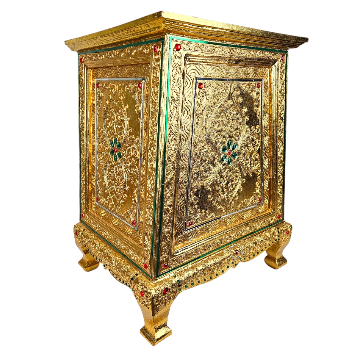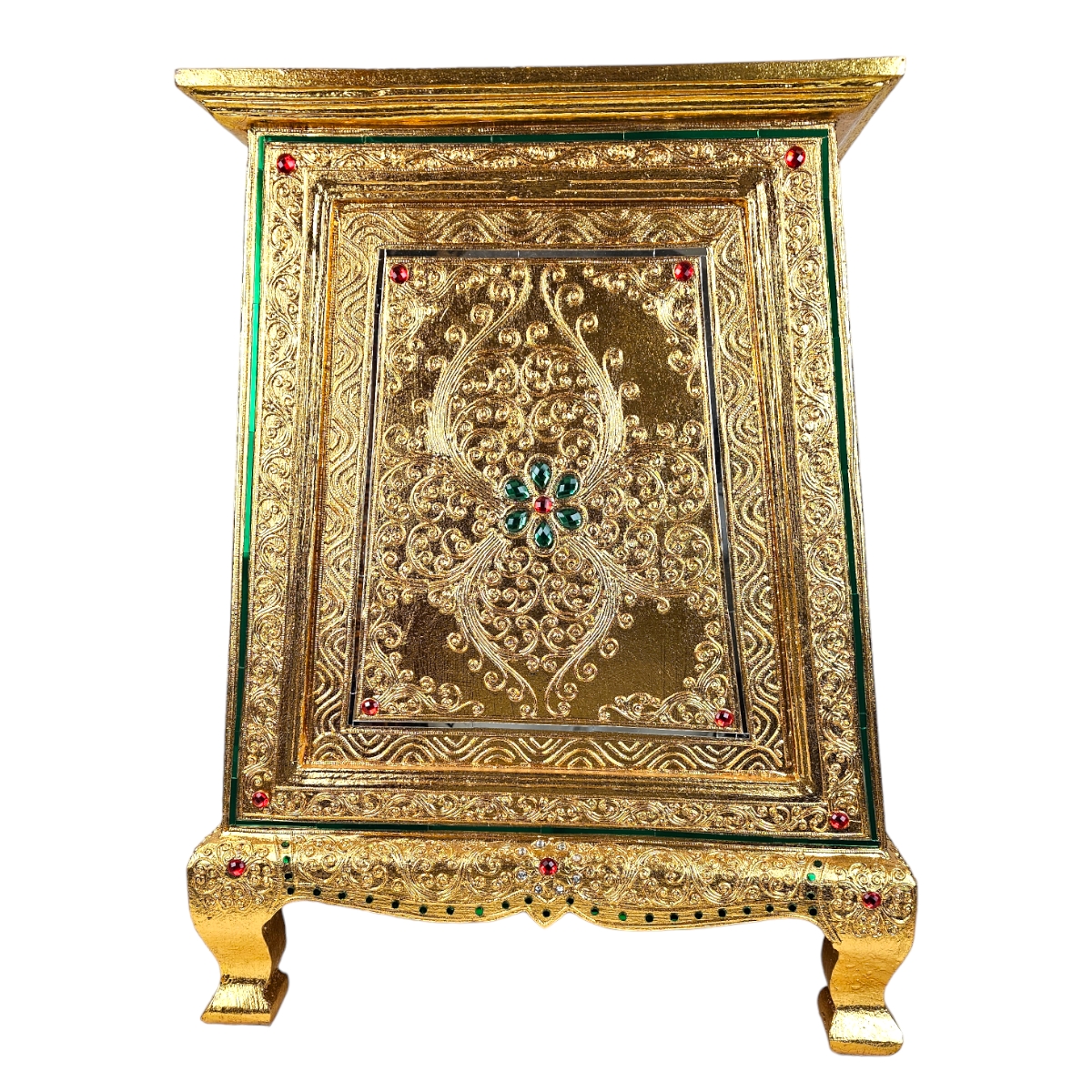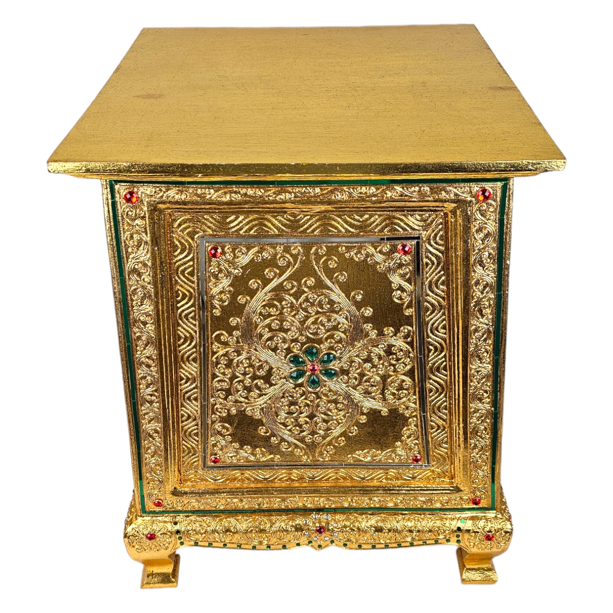 Attraktiv und anspruchsvoll präsentiert sich unsere handgefertigte Kommode aus Thailand. Sie vereint eine wunderbare Mischung aus Tradition und Moderne. Mit ihrem goldenen Äußeren und den eingearbeiteten Mosaiksteinen wird sie zum Blickfang in jedem Raum. Ihr erstklassiges Design und ihre hohe Funktionalität versprechen langanhaltende Freude an diesem einzigartigen Möbelstück. Entdecken Sie das Gefühl von Luxus und Exklusivität, das diese Kommode ausstrahlt. Sie wird nicht nur ihre Umgebung verschönern, sondern auch als praktischer Aufbewahrungsort dienen. Lassen Sie sich von dem Charme und der Einzigartigkeit dieser meisterhaft gefertigten Kommode verzaubern.