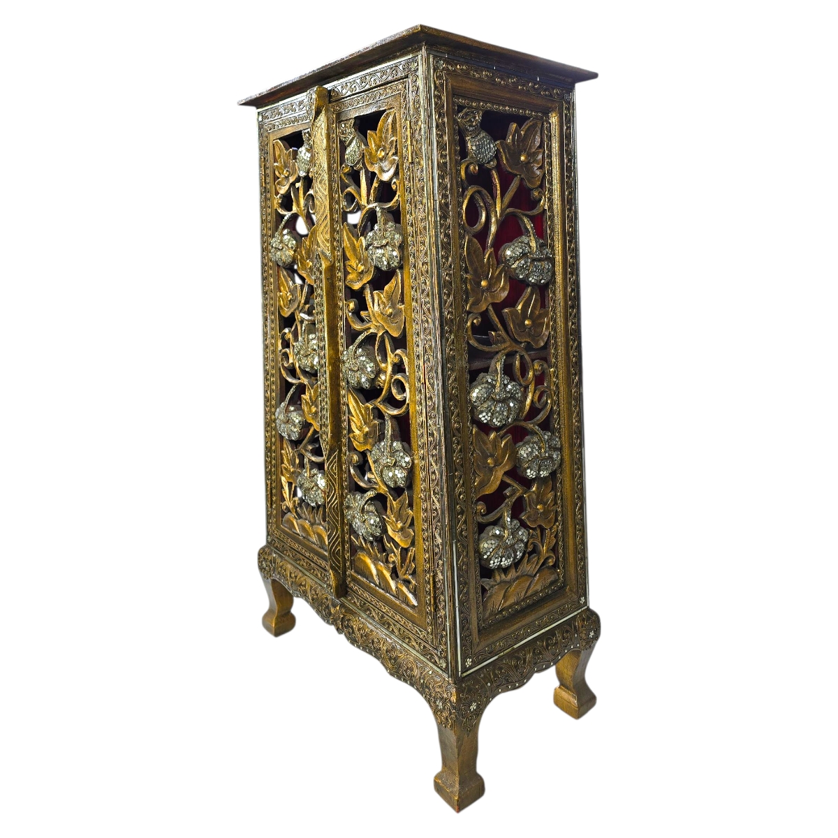 Was den Schrank Relief wirklich einzigartig macht, ist die Kombination aus traditioneller thailändischer Handwerkskunst und modernem Design. Jedes Detail erzählt von der Sorgfalt und Leidenschaft, mit der er gefertigt wurde. Die Reliefarbeit mit floralen Motiven in Kombination mit bunten Mosaiksteinen ist nicht nur ein Fest für die Sinne, sondern auch ein Ausdruck von Kreativität und kulturellem Erbe. Dieser Schrank ist mehr als nur ein Möbelstück; er ist ein Kunstwerk, das Geschichten erzählt und eine inspirierende Aura von exotischer Schönheit mit sich bringt.