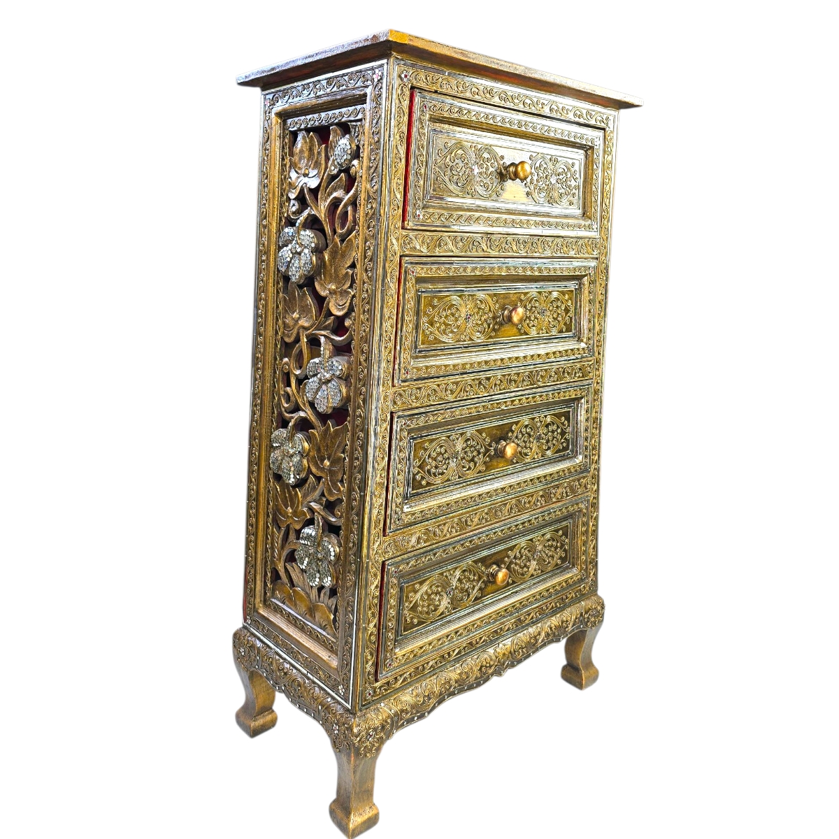 Was den Schrank Relief wirklich einzigartig macht, ist die Kombination aus traditioneller thailändischer Handwerkskunst und modernem Design. Jedes Detail erzählt von der Sorgfalt und Leidenschaft, mit der er gefertigt wurde. Die Reliefarbeit mit floralen Motiven in Kombination mit bunten Mosaiksteinen ist nicht nur ein Fest für die Sinne, sondern auch ein Ausdruck von Kreativität und kulturellem Erbe. Dieser Schrank ist mehr als nur ein Möbelstück; er ist ein Kunstwerk, das Geschichten erzählt und eine inspirierende Aura von exotischer Schönheit mit sich bringt.