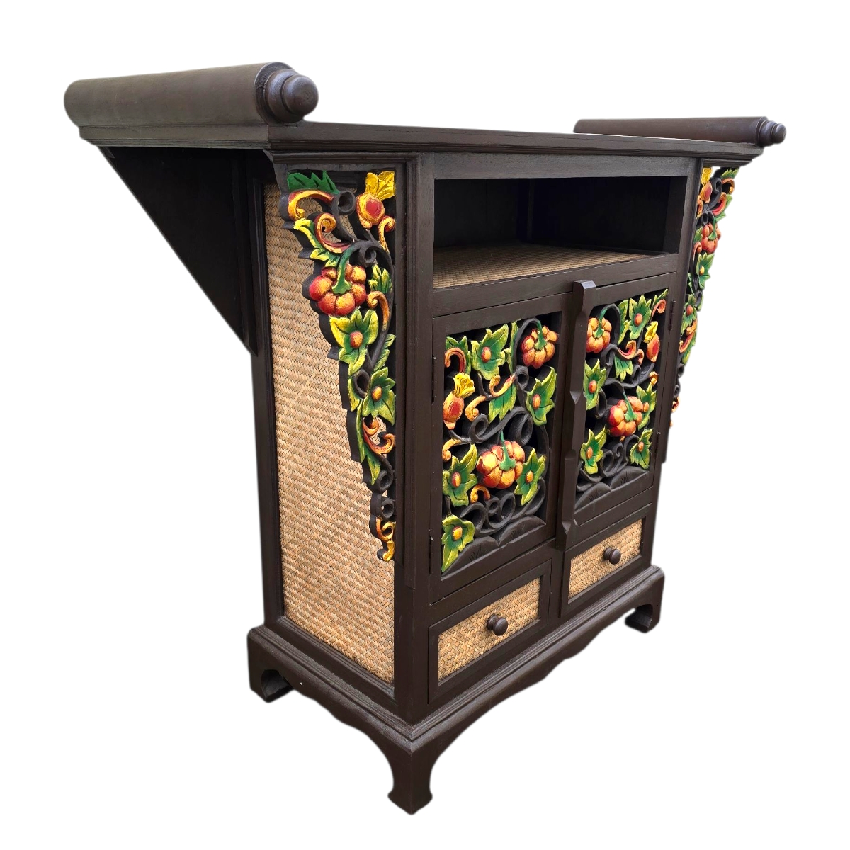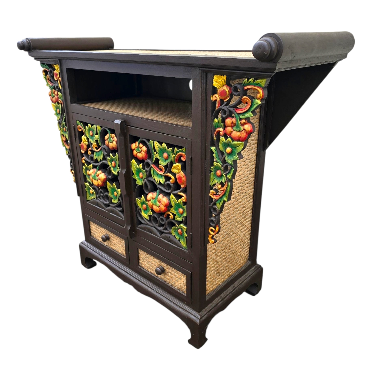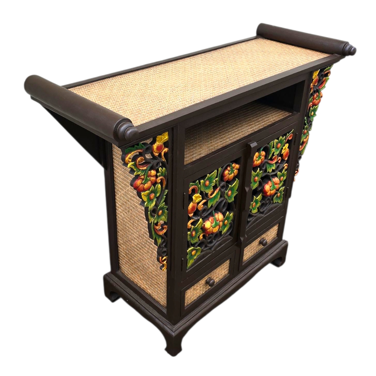 - Künstlerische Gestaltung: An den Seiten der Kommode finden Sie bunte Reliefs, die kunstvoll von Hand gefertigt wurden. Diese dekorativen Elemente fügen einen Hauch von farbenfrohem Flair hinzu und machen die Kommode zu einem wahren Blickfang.