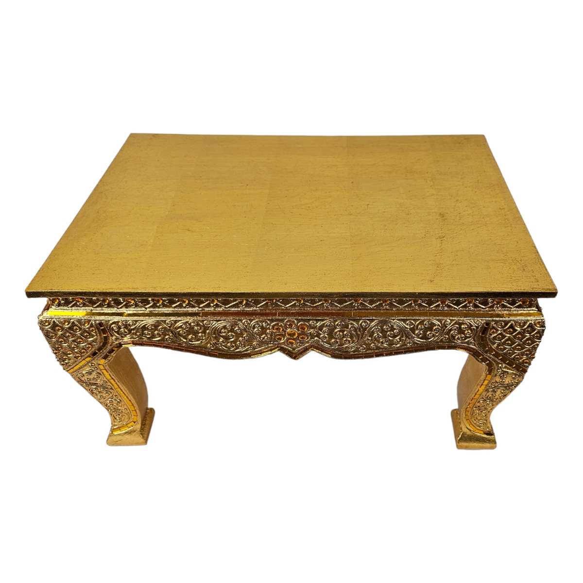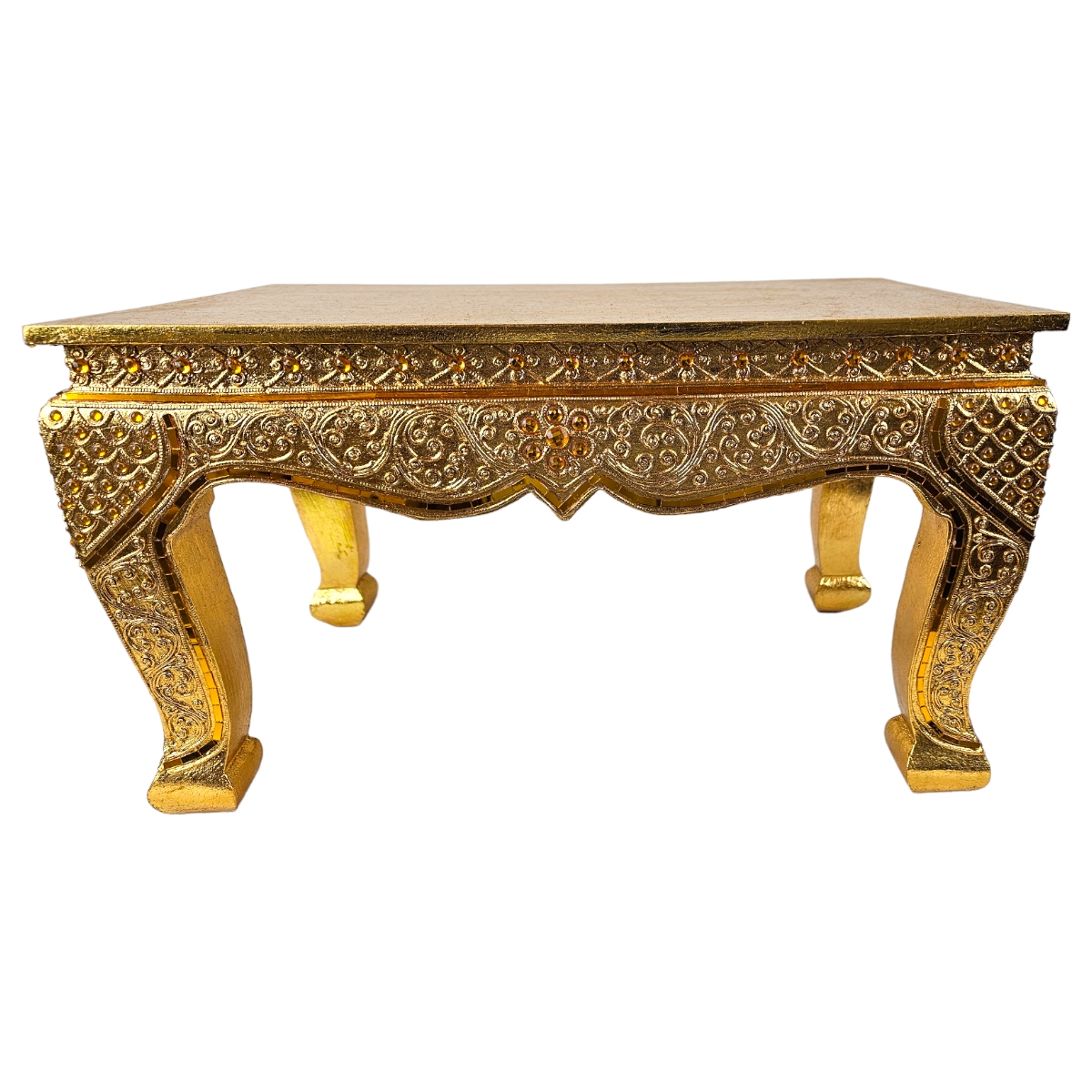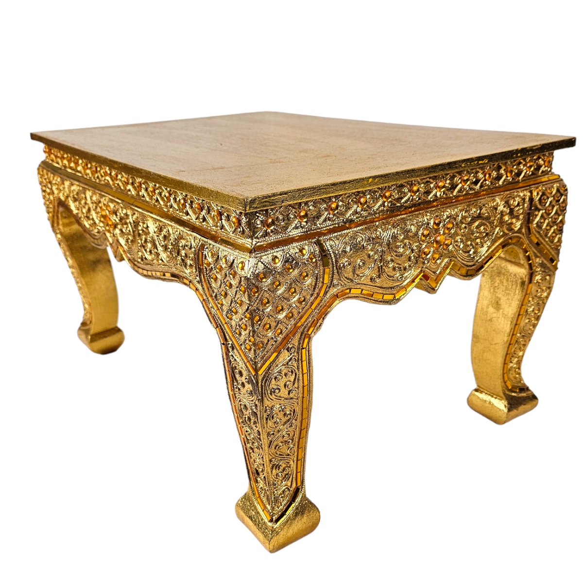 "Entdecken Sie den unvergleichlichen Charme dieses handgefertigten Beistelltisches aus Thailand. Mit seinem goldenen Farbton und den kunstvoll eingearbeiteten Mosaiksteinen wird er sofort zum Hingucker in jedem Raum. Durch seine handgefertigte Herstellung strahlt er ein einzigartiges, exotisches Flair aus, das Sie in ferne Welten entführt. Setzen Sie einen Hauch von Luxus in Ihr Zuhause mit diesem wunderschönen Beistelltisch."